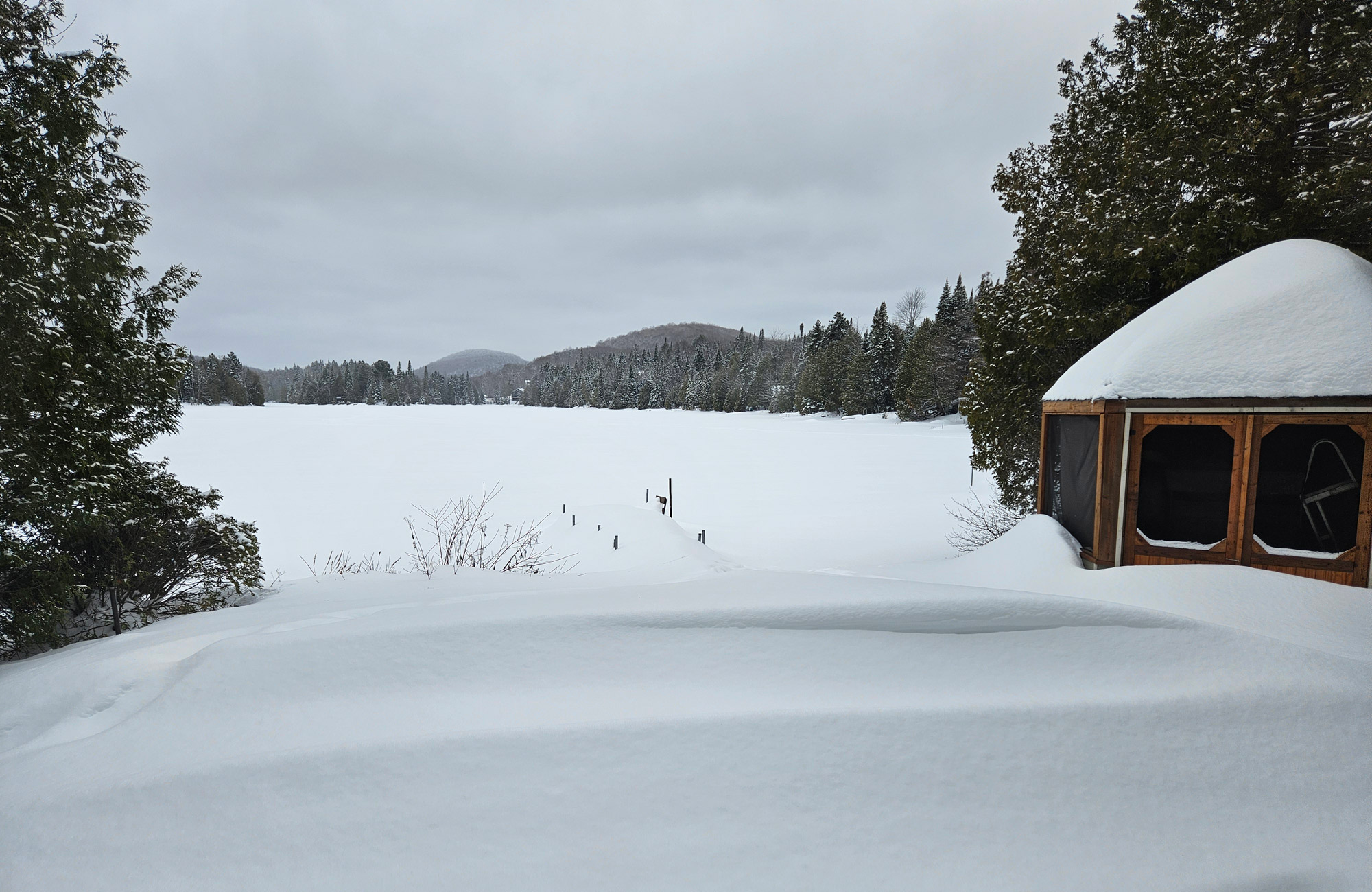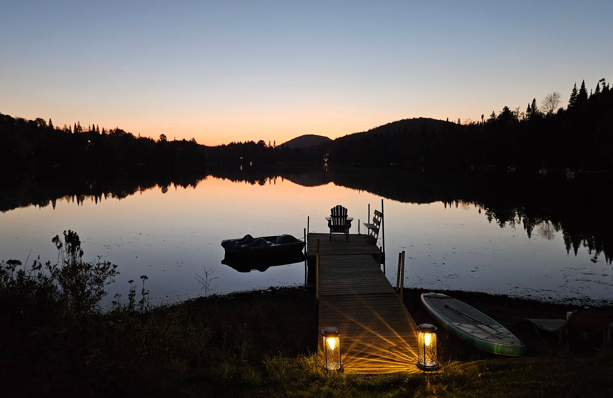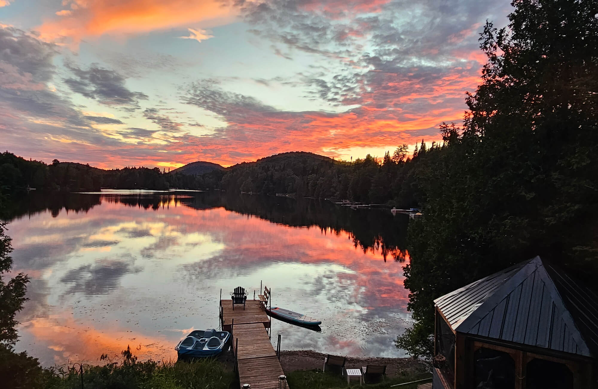 L’espace extérieur est conçu pour la détente et pour profiter de la beauté du lac. Un gazebo cosy offre ombre et confort, tandis que la cheminée extérieure avec quatre fauteuils Adirondack et un canapé crée l’endroit parfait pour les soirées. Une table à manger permet de savourer les repas en plein air, et le quai donne un accès direct au lac pour le kayak ou le pédalo. Vous trouverez également un espace herbeux pour les loisirs, une petite plage de sable avec des transats pour se détendre, et un hamac avec vue sur le lac — un endroit idéal pour se reposer et profiter du calme.